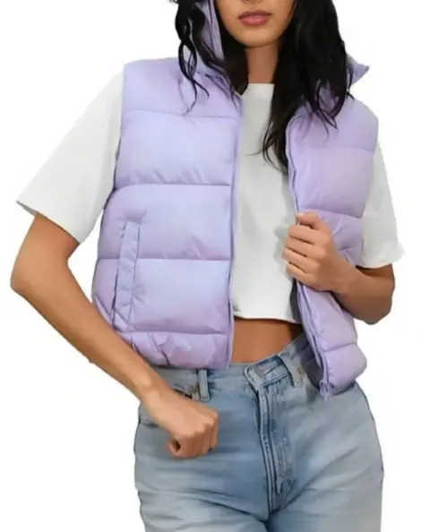 CHALECO ACOLCHONADO TALLA M. CHALECO, TALLA M, SUAVECITO POR DENTRO,MIDE DE HOMBRO A HOMBRO 41 CM, DE AXILA A AXILA 49.5CM,DE LARGO 47 CM, LILA TORNASOL