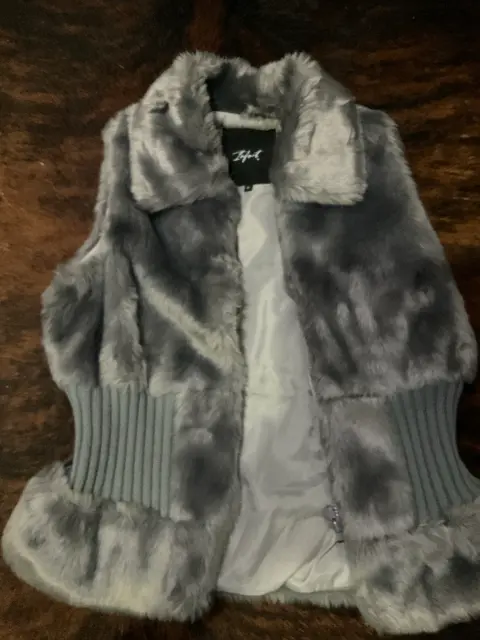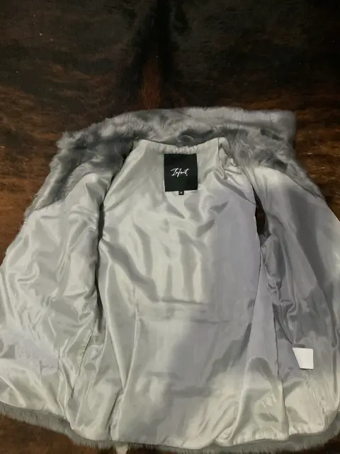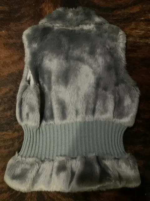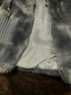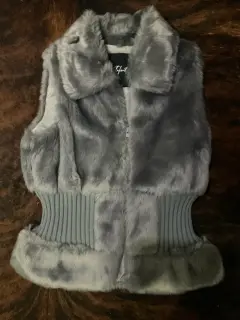 Chaleco de felpa color gris/plata para dama Talla G usado en buen estadoCierre al frente, forro en el mismo tono Cintura marcada con tela entretejidaMedidas hombro-hombro 37cm axila-axila 48cm largo 60cm