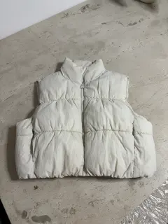 Chaleco puffer en tejido guateado. Modelo corto con cuello cisne, zíper y bolsillos discretos al frente. Forrado.
