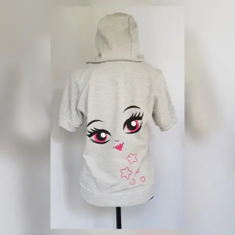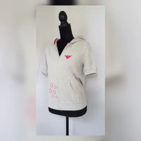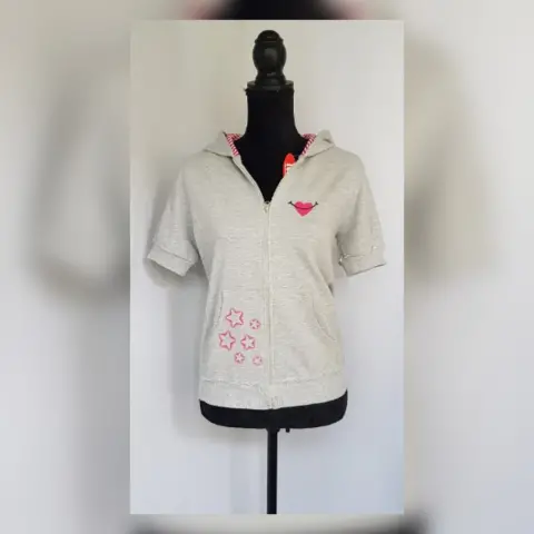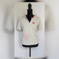 Chamarra Capucha Manga Corta. Chamarra en color GRIS SIBERIA modelo "Stars" c/estampado en tonos ROSA BARBIE/NEGRO, capucha integrada c/forro fantasía interior NO DESMONTABLE, cierre p/cremallera, bolso delantero tipo canguro y manga corta. Talla M. Dimensiones cms: 40 hombro, 49 axila, 48 cintura, 42 zona baja, 57 largo, 23 largo manga. 50% algodón, 50% poliéster. Para lavado en casa.***Esta marca maneja prendas de extraordinaria calidad, su algodón es orgánico y soporta ciclos de lavado en máquina sin problemas, no se deslavan los estampados y las telas salen casi sin arrugas.***