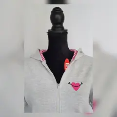Chamarra en color GRIS SIBERIA modelo "Stars" c/estampado en tonos ROSA BARBIE/NEGRO, capucha integrada c/forro fantasía interior NO DESMONTABLE, cierre p/cremallera, bolso delantero tipo canguro y manga corta. Talla M. Dimensiones cms: 40 hombro, 49 axila, 48 cintura, 42 zona baja, 57 largo, 23 largo manga. 50% algodón, 50% poliéster. Para lavado en casa.***Esta marca maneja prendas de extraordinaria calidad, su algodón es orgánico y soporta ciclos de lavado en máquina sin problemas, no se deslavan los estampados y las telas salen casi sin arrugas.***