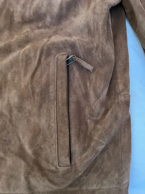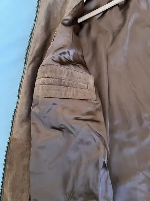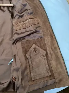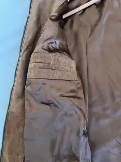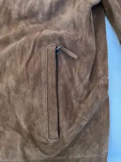 De gamuza color café , en buen estado , tiene unas manchas obscuras en la manga por el uso , muy pequeñas no se aprecian en la foto .