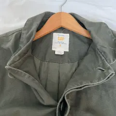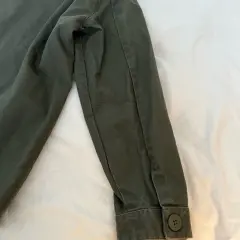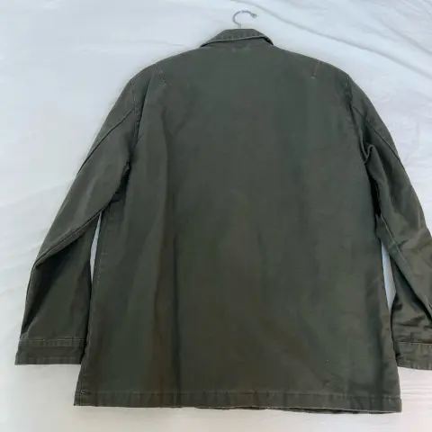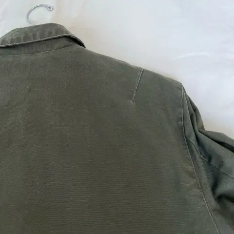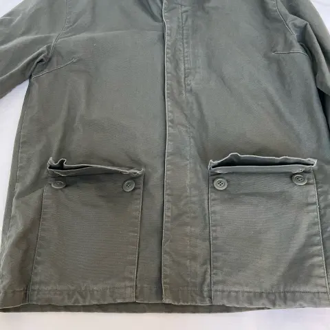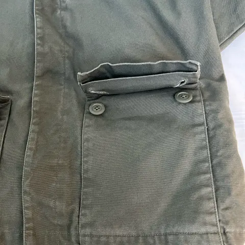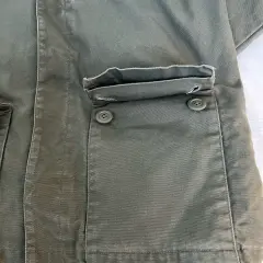 Chamarra de lona verde olivo. De lona , sin decoloraciones , ni rasgaduras . Tipo militar