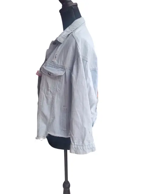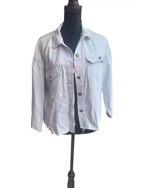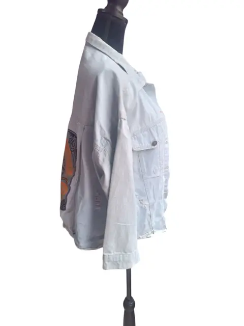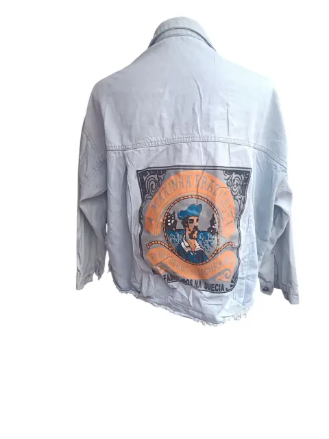 CHAMARRA DE MEZCLILLA, DELGADA, UNITALLA, QUEDA HASTA XL, TIPO OVERSIZE,ESTAMPADO DE PIRATA ATRAS, DISTRESSED FASHION, MIDE DE HOMBRO A HOMBRO 53 CM, DE AXILA A AXILA 54 CM,DE LARGO 54 CM,2 BOLSILLOS FUNCIONALES, BOTONES AL REDEDOR DEL CUELLO TRANSPARENTES