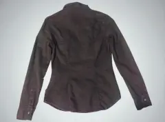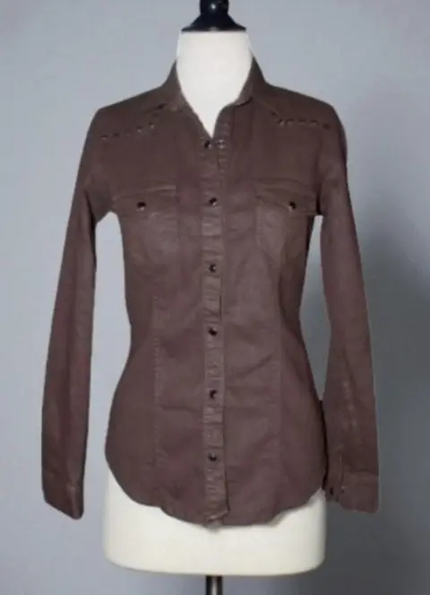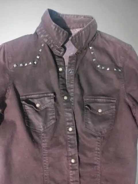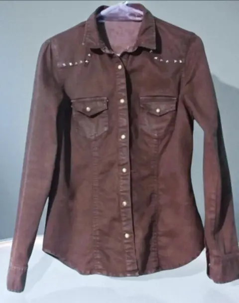 La chamarra es de color marrón estilo vintage y está hecha de mezclilla recubierta, lo que le da una apariencia ligeramente rígida. Dispone de dos bolsillos frontales con broches. Presenta estoperoles piramidales en la parte delantera Incluye costuras curvas que le dan forma a la prenda. En buenas condiciones sin detalles visibles.