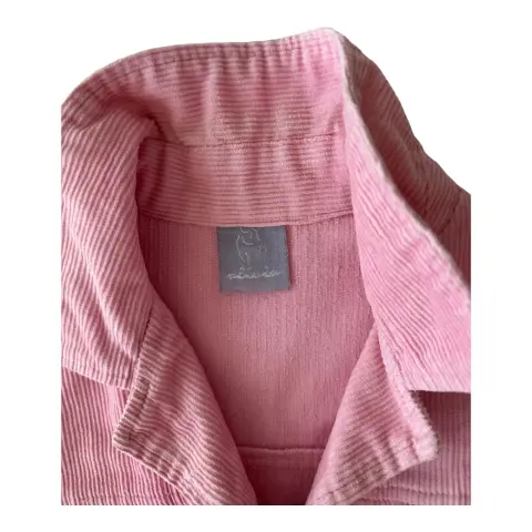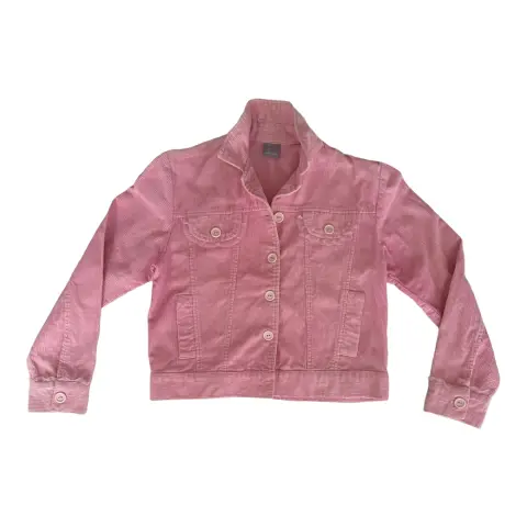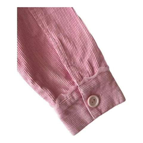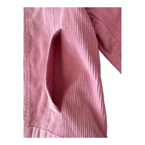 Chamarra rosa de pana, no tiene bolsillos, todos son adorno. El color es más bajo que las fotos y en algunas partes se ve como despintado. Se aprecia en las fotos. No estira. No tiene forro.Talla: 7Medidas: 40 cm hombros, 45 cm axila y 49 cm largo.