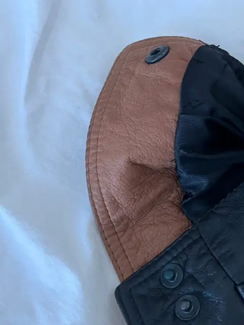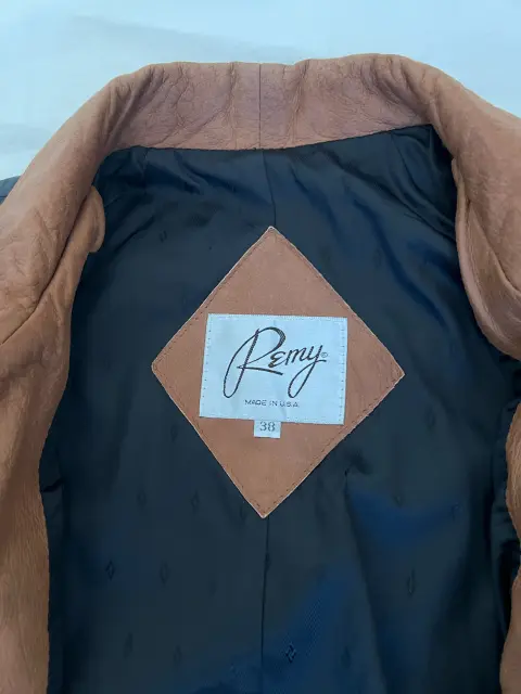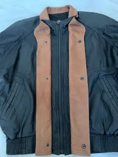 Es una chamarra de piel americana, está impecable , sin manchas , sin irregularidades , un poco uso en el cuello .