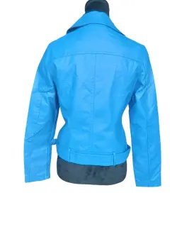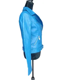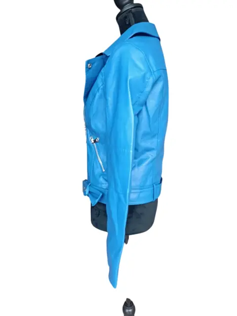 CHAMARRA VINIPIEL, TALLA S, MIDE DE HOMBRO A HOMBRO 39 CM, DE AXILA A AXILA 47 CM,DE LARGO 51 CM, AZUL ELECTRICO