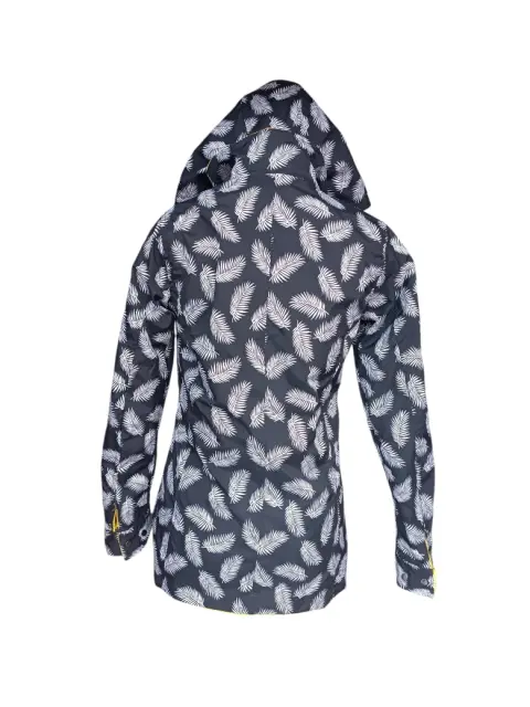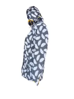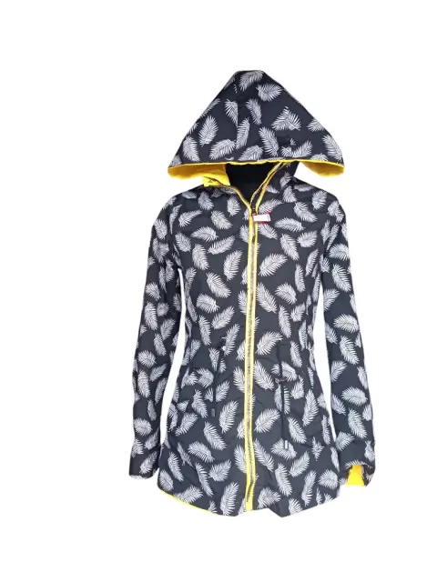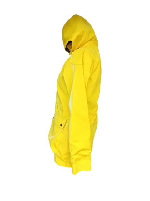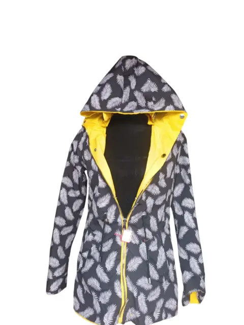 CHAMARRA DOBLE VISTA, AMARILLA TIPO IMPERMEABLE,DEL OTRO BLANCA CON NEGRO (HOJAS) TIPO ROMPEVIENTOS, TALLA S, CADA VISTA TIENE 2 BOLSILLOS FUNCIONALES, GORRO DESMONTABLE, MIDE DE HOMBRO A HOMBRO 37 CM,DE AXILA A AXILA 46 CM,DE LARGO 70 CM