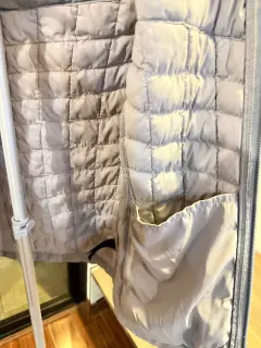 Chamarra gris bien conservada. Tiene bolsas internas que son muy prácticas. Tiene un ligero color amarillo que casi no se nota. Fuera de eso está perfecta. Es ligera y muy calientita