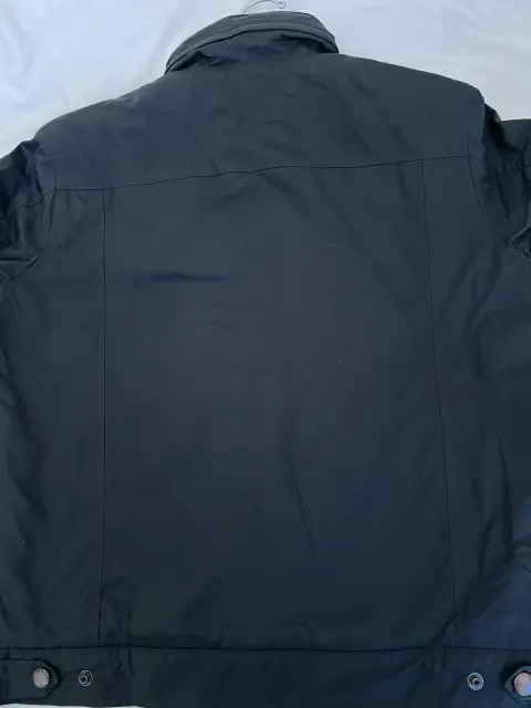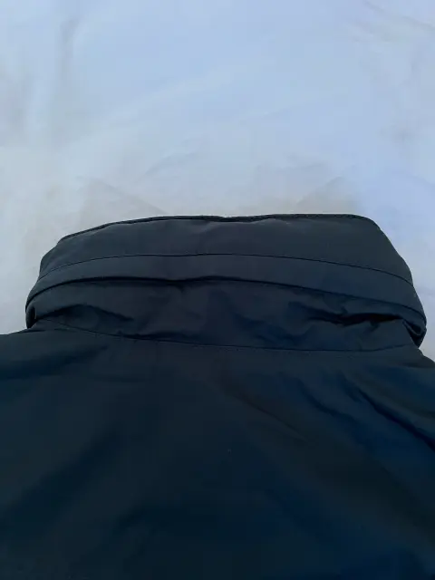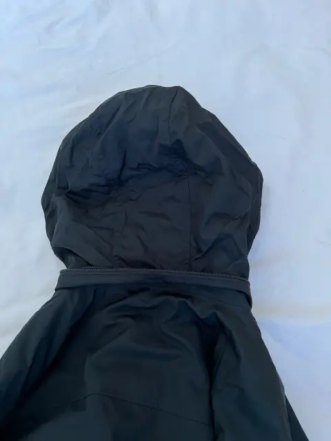 Chamarra impermeable con interior afelpado , sin manchas o irregularidades, con gorro que se puede guardar en un compartimento del cuellos .