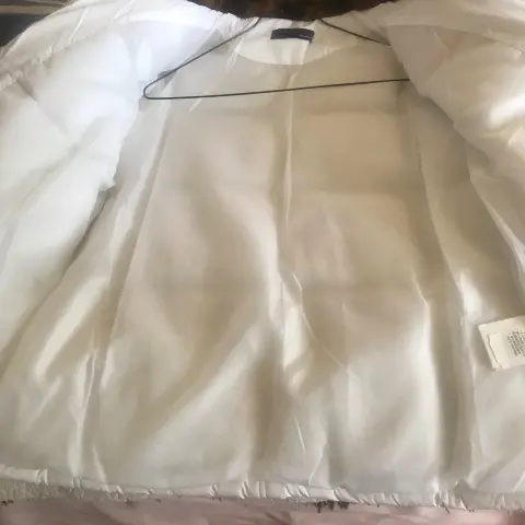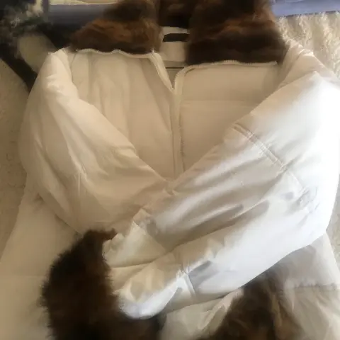 Chamarra blanca con acabados de pelo sintético muy hermosa y caliente talla mediana