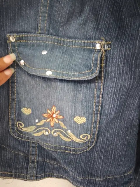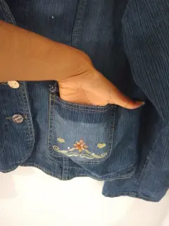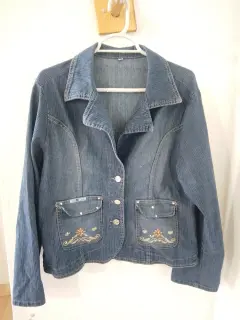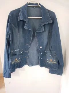 Chaqueta de mezclilla con flores bordadas. Largo manga 58 Ancho manga 16 Largo delante 52 Ancho hombro a hombro 43 Largo atrás 57 Detalles recién pintada de color azul marino si tiene unas partes deslavado Bolsas con bordado y detalles( en las fotos se ve profundidad y cercanía al bordado) Botones completos (3 botones) Sin forro