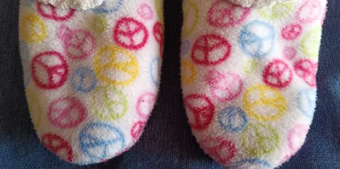 Pantuflas de viaje Snoozies. Cómodas, calientitas, y fáciles de llevar. Pantuflas de viaje multicolor. Marca Snoozies. Hechas en China. Talla Grande. Se ajustan a tallas de zapato 23, 24 o 25.