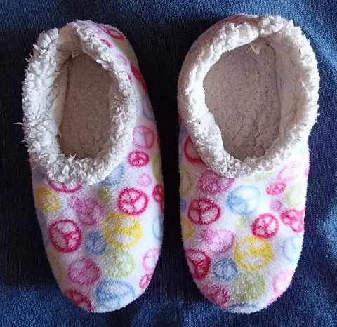 Cómodas, calientitas, y fáciles de llevar. Pantuflas de viaje multicolor. Marca Snoozies. Hechas en China. Talla Grande. Se ajustan a tallas de zapato 23, 24 o 25.
