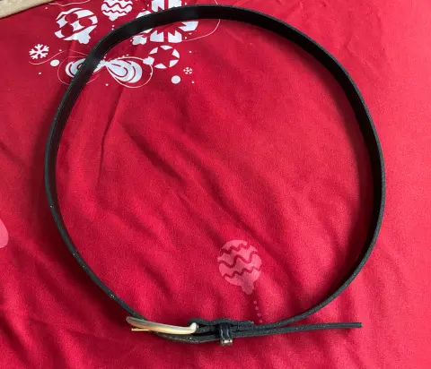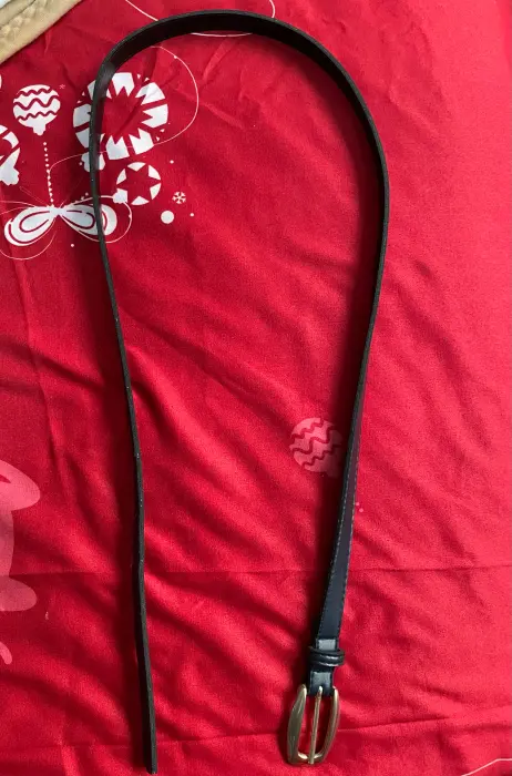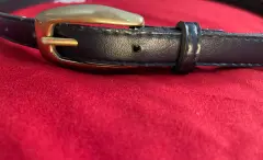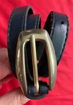 Cinturón delgado, de piel sintética, azul marino con hebilla dorada. Largo total 102 cms, al primer agujero 79 cms, al último 90 cms, ancho 1.5 cms. En perfecto estado, sin detalles