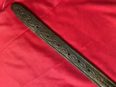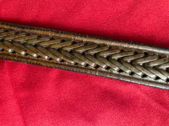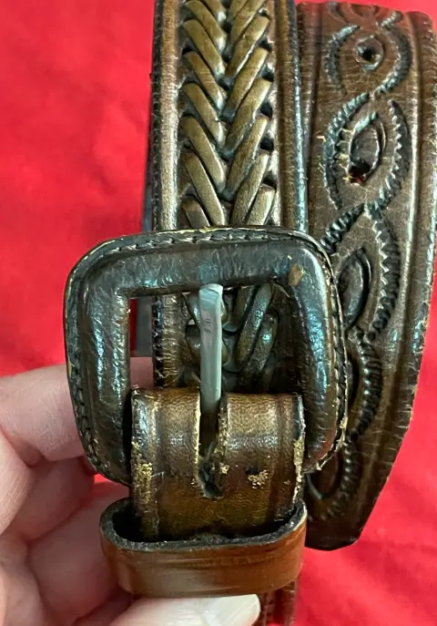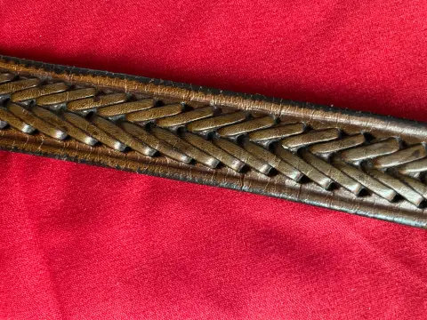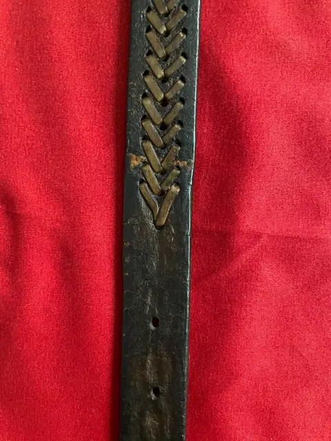 Cinturón de piel café hecho a mano, textura trenzada y grabado. Largo total 92 cms, al primer agujero 72 cms, al último 85 cms, ancho 2.5 cms. Detalles de desgaste de la piel por el uso.