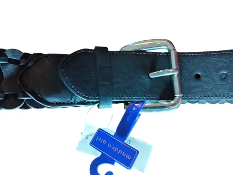 Madden Girl Cinturon Trensado Casual, talla mediana, color negro cenizo, hebilla rectangular metálica gruesa, hecho de cuero sintetico, mide 107cm de largo con 5cm de ancho, nuevo a estrenar con etiqueta.