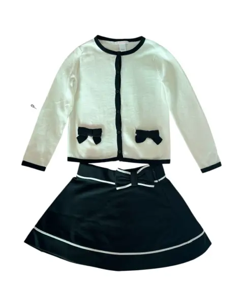 Hermoso conjunto para niña de la marca Janie and Jack. Incluye falda negra con blanco y suétercito con botones y moños decorativos en las bolsas. Ideal para ocasiones especiales o looks arreglados con un toque clásico y tierno.