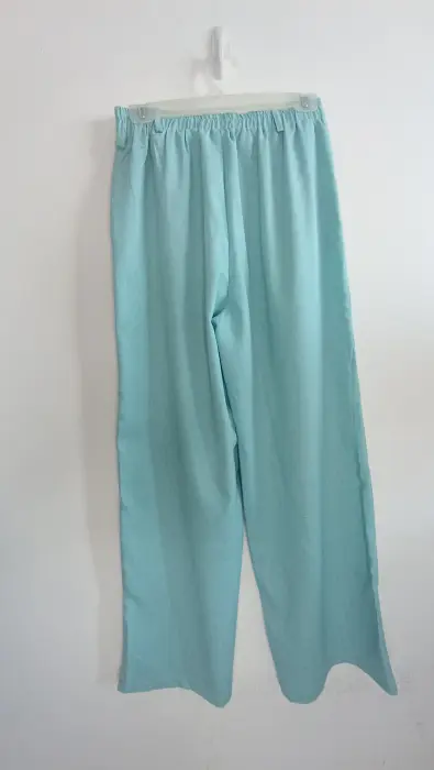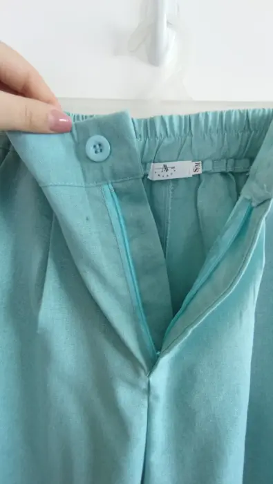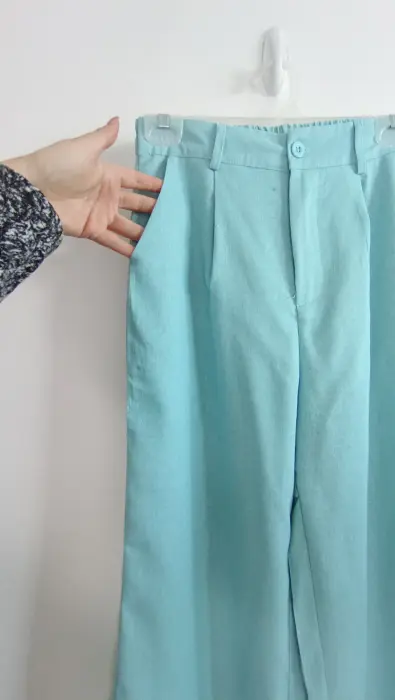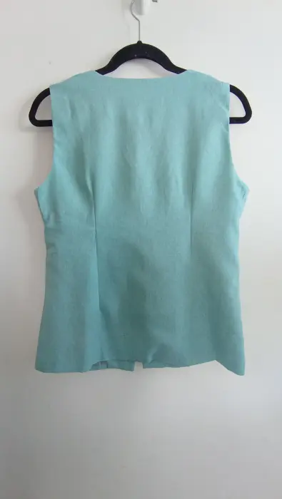 Conjunto azul chaleco y pantalón. La tela es lino; muy fresca. El chaleco tiene forro con botones color dorado, el pantalón tiene botón y cierre y elástico en la parte de atrás para mayor comodidad, corte recto tipo wide leg. Marca Amanda, talla S/M. Medidas aprox chaleco: 48cm de axila a axila, 61 cm de largo, 45cm cintura, pantalón: 34cm de cintura, 33cm de tiro, 51 cm de cadera, 106cm de largo. Precio $450
