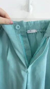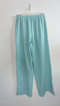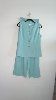 La tela es lino; muy fresca. El chaleco tiene forro con botones color dorado, el pantalón tiene botón y cierre y elástico en la parte de atrás para mayor comodidad, corte recto tipo wide leg. Marca Amanda, talla S/M. Medidas aprox chaleco: 48cm de axila a axila, 61 cm de largo, 45cm cintura, pantalón: 34cm de cintura, 33cm de tiro, 51 cm de cadera, 106cm de largo. Precio $450