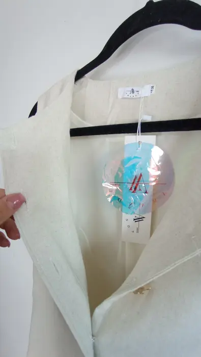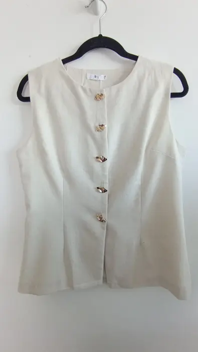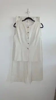 Conjunto beige chaleco y pantalón. La tela es lino; muy fresca. El chaleco tiene forro con botones color dorado, el pantalón tiene botón y cierre y elástico en la parte de atrás para mayor comodidad, corte recto tipo wide leg. Marca Amanda, talla S/M. Medidas aprox chaleco: 48cm de axila a axila, 61 cm de largo, 45cm cintura, pantalón: 34cm de cintura, 33cm de tiro, 51 cm de cadera, 106cm de largo. Precio $450