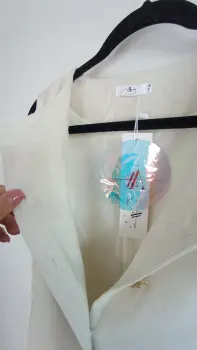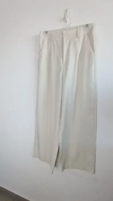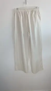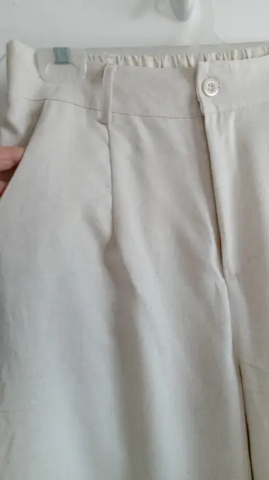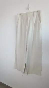 La tela es lino; muy fresca. El chaleco tiene forro con botones color dorado, el pantalón tiene botón y cierre y elástico en la parte de atrás para mayor comodidad, corte recto tipo wide leg. Marca Amanda, talla S/M. Medidas aprox chaleco: 48cm de axila a axila, 61 cm de largo, 45cm cintura, pantalón: 34cm de cintura, 33cm de tiro, 51 cm de cadera, 106cm de largo. Precio $450