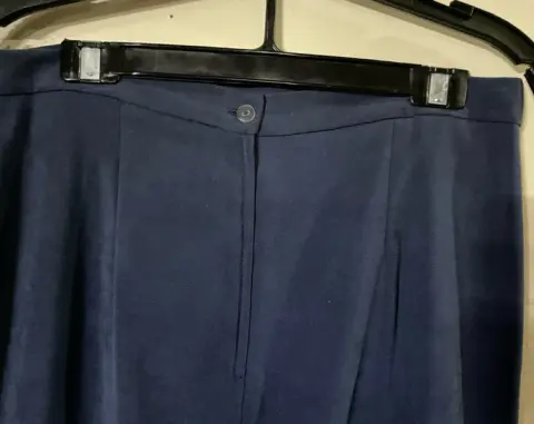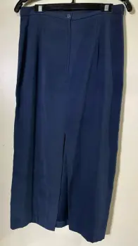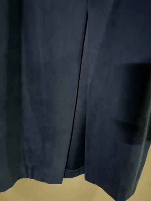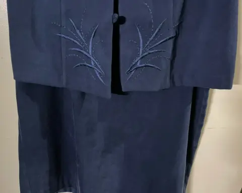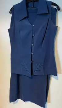 Bonito conjunto tipo gamuza, de chaleco con detalle bordado en la parte inferior y falda larga con abertura por detrás y cierre. El chaleco tiene un broche oculto arriba. Solo le falta el último botón de abajo. Chaleco: ancho axilas 46 cms. Falda recta: cintura 40 cms, largo 89 cms. Talla 11