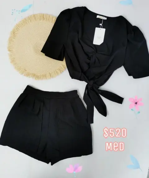 Set de top y Falda short. Hermoso set de top con mangas aglobadas u Falda short en color negro.Nuevo con etiquetaSe ve divino!