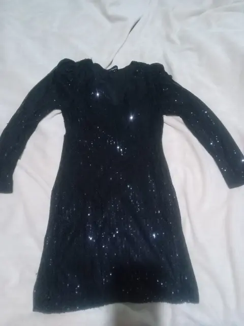 Vestido de fiesta. Vestido negro de lentejuela puesto solo 1 vez ,nada roto largo arriba de la rodilla, manga larga ña tela no estira