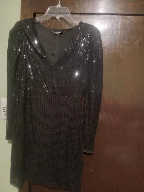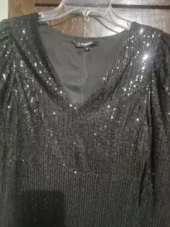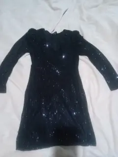 Vestido negro de lentejuela puesto solo 1 vez ,nada roto largo arriba de la rodilla, manga larga ña tela no estira