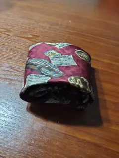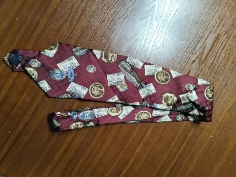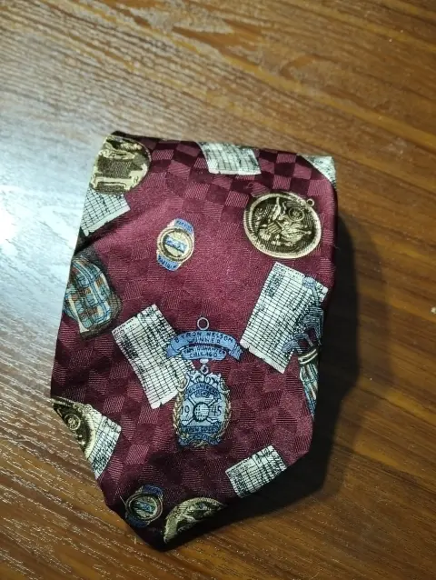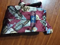 Corbata Formal Grafica Bryan Nelson. Corbata Formal Grafica Bryan Nelson, color rojo tinto con gráficos cafés azul multicolor, hecha de seda con forro interior, el acento ideal para complementar tus atuendos formales, previamente usada en perfectas condiciones