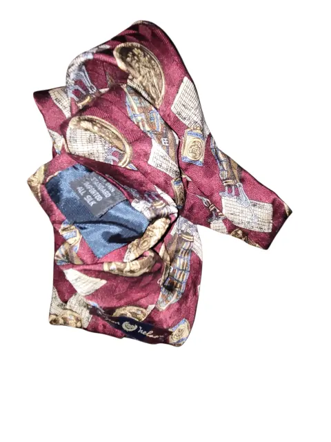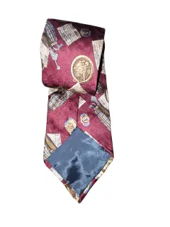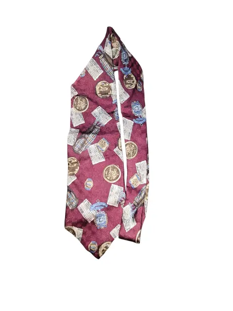 Corbata Grafica de Seda Our Own Standart, color Rojo oscuro con graficos de diferentes diseños, forrada por dentro, hecha de Seda, mide 145cm de largo con el lado frontal de 10cm de ancho, previamente usada en perfectas condiciones cosmeticas