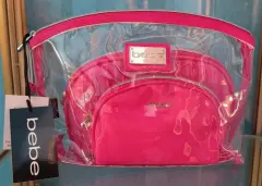 Cosmetiquera BEBE. Hermoso juego de cosmetiqueras, perfecto para guardar tu maquillaje entre otras cosas, 3 pzas, chica, mediana y grande. La más grande mide de largo 30 cm, de alto 20 cm y de ancho 10 cm. Incluye 2 botellas de plástico con una capacidad de 50 ml c/u.