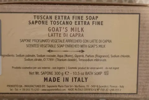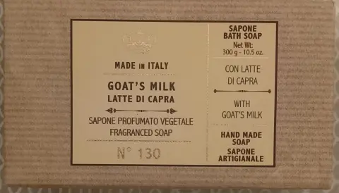 Este es un jabón de baño de leche de cabra de la marca italiana Saponerie Mario Fissi ♦️Marca: Saponerie Mario Fissi ♦️Ingredientes principales: Leche de cabra, 100% vegetal.♦️Características: Jabón perfumado, hecho a mano, nutritivo y con propiedades antibacterianas.♦️Origen: Fabricado en Italia.