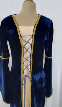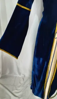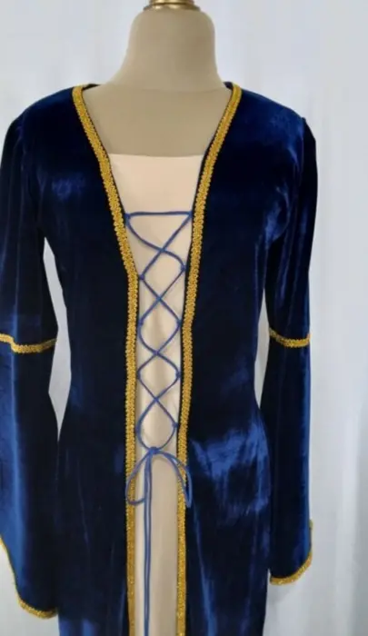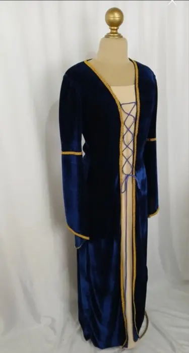 Vestido medieval terciopelo azul dorado. Vestido largo medieval de terciopelo con lindos detalles dorados, tiene para ajustar cintura tiras de cuernito.Talla MEstira.De una sola piezaUna sola vez puesto