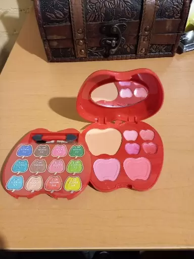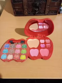 Estuche cosmético forma de manzana 🍎 Roja. Contiene 12 dombras, 4 labiales, 2rubores y un polvo compacto así como sus aplicadores.