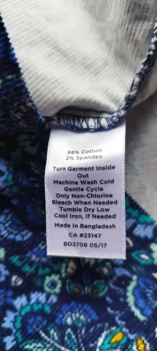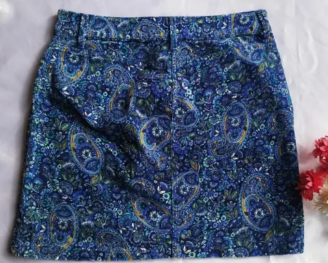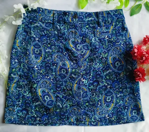 Falda de pana y estampado paisley azul de Talbots, corte en A, con cinturilla fija de 1,5", dos bolsillos delanteros (cosidos) y cierre de cremallera en la parte delantera. Sin forroTalla 4p (CH)Medidas tomadas por un solo lado:*Cintura 37 cm*Largo 42 cm