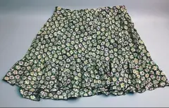 Falda corta con un diseño de volantes escalonados. Tiene un estampado floral, las flores son predominantemente blancas con centros amarillos y algunos toques de color púrpura y verde. El estampado floral se asienta sobre un fondo negro. Tiene un borde oscuro en el dobladillo inferior que realza los volantes. La parte superior tiene un resorte que estira ligeramente y cierre lateral.
