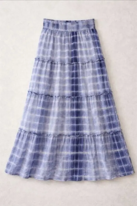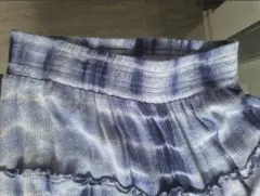 Falda larga en tonos azul con efecto tie-dye. Cuenta con pretina elástica que se ajusta cómodamente a la cintura y diseño en capas que le da movimiento y un estilo bohemio. Tela ligera y fresca, perfecta para clima cálido o entretiempo. Se encuentra en muy buenas condiciones, sin detalles visibles. Ideal para looks casuales, de playa o para combinar con blusas básicas.