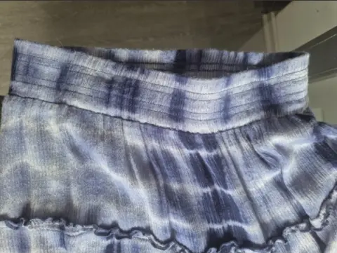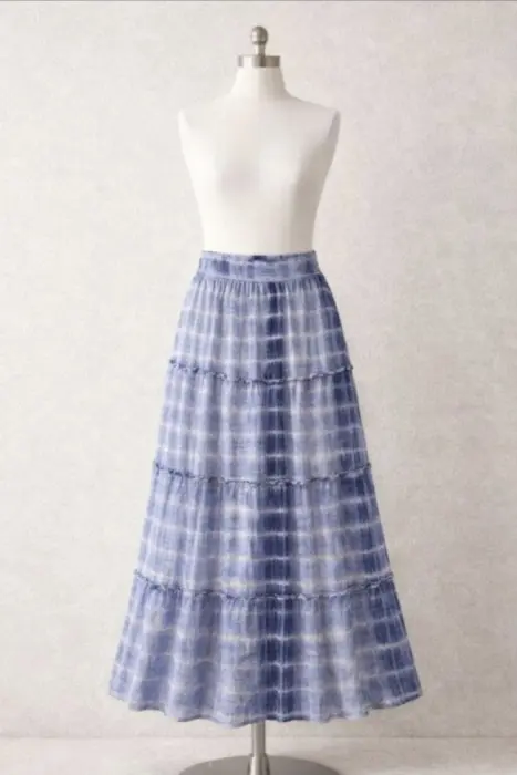 Falda larga azul con diseño tie-dye. Falda larga en tonos azul con efecto tie-dye. Cuenta con pretina elástica que se ajusta cómodamente a la cintura y diseño en capas que le da movimiento y un estilo bohemio. Tela ligera y fresca, perfecta para clima cálido o entretiempo. Se encuentra en muy buenas condiciones, sin detalles visibles. Ideal para looks casuales, de playa o para combinar con blusas básicas.