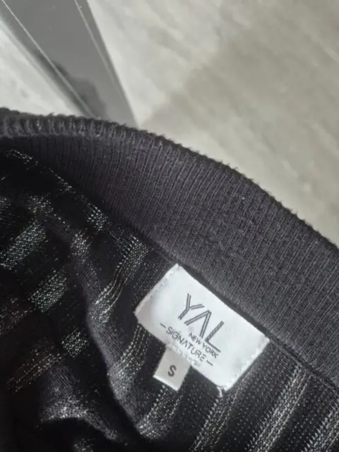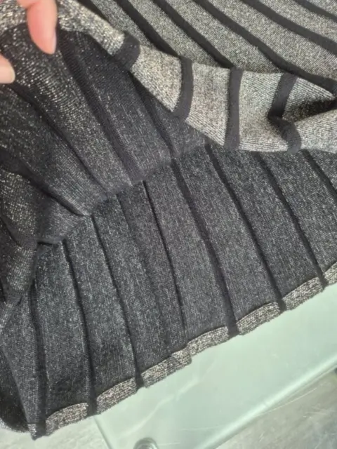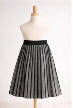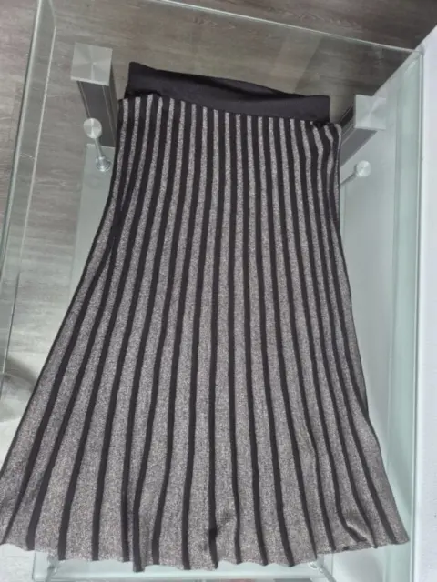 Hermosa falda negra con lineas brillosas, tiene una textura como de sueter. Cintura co resorte, muy cómoda para epoca de frío. La talla es S, pero viene amplia