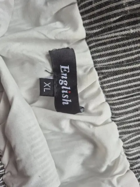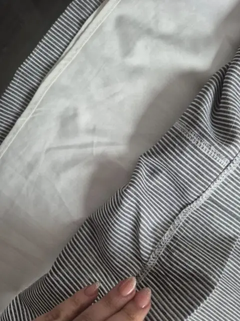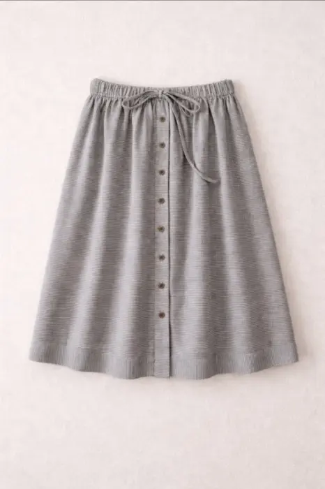 Falda midi de corte A, con diseño de rayas en tonos beige y azul. Tela con textura tipo lino, fresca y cómoda. Cuenta con cintura estructurada, botón al frente y bolsillos laterales. Diseño original con paneles de rayas en distintas direcciones que le dan un toque moderno y elegante. Ideal para uso diario, oficina o salidas casuales. En excelentes condiciones.