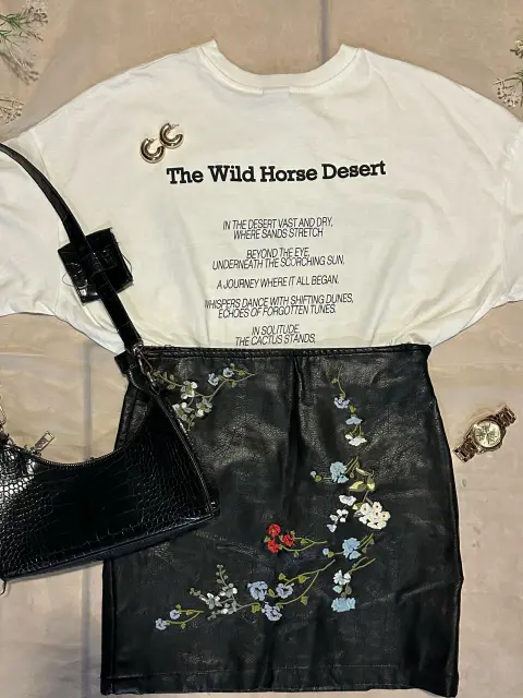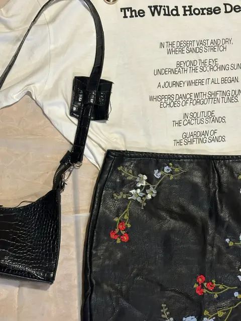 Falda negra cuero bordado flores - Talla chica- Largo 40-Cintura 72 cm