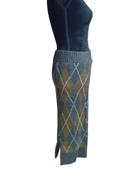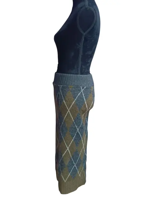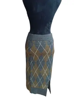 MAXI FALDA TALLA S, COLOR GRIS CON VERDE, FIGURAS DE ROMBOS, MARCA MYSTREE, 74% ACRÍLICO 22% POLIÉSTER Y 4% SPANDEX, MIDE DE CINTURA 36 CM Y DE LARGO 74 CM