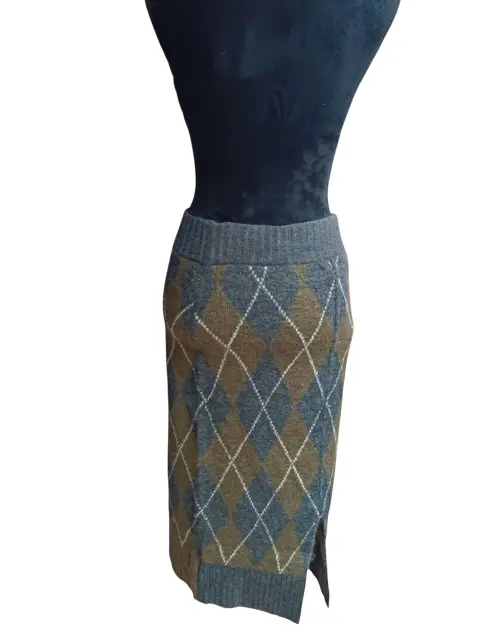 MAXI FALDA TALLA S. MAXI FALDA TALLA S, COLOR GRIS CON VERDE, FIGURAS DE ROMBOS, MARCA MYSTREE, 74% ACRÍLICO 22% POLIÉSTER Y 4% SPANDEX, MIDE DE CINTURA 36 CM Y DE LARGO 74 CM