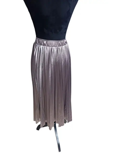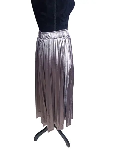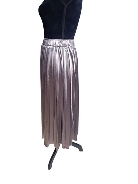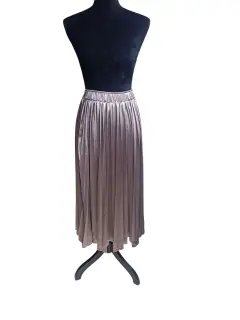 MAXIFALDA PLISADA TALLA L. MAXIFALDA COLOR GOLD ROSE, MARCADA COMO L, PERO QUEDA DESDE S (CINTURA CON RESORTE), MARCA FRIFUL,100 % POLIESTER,CINTURA 62 CM, CADERA 120 CM, LARGO 81 CM