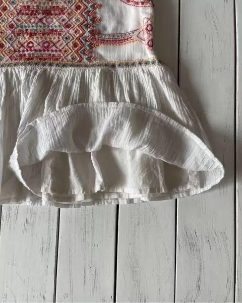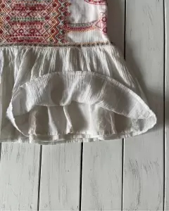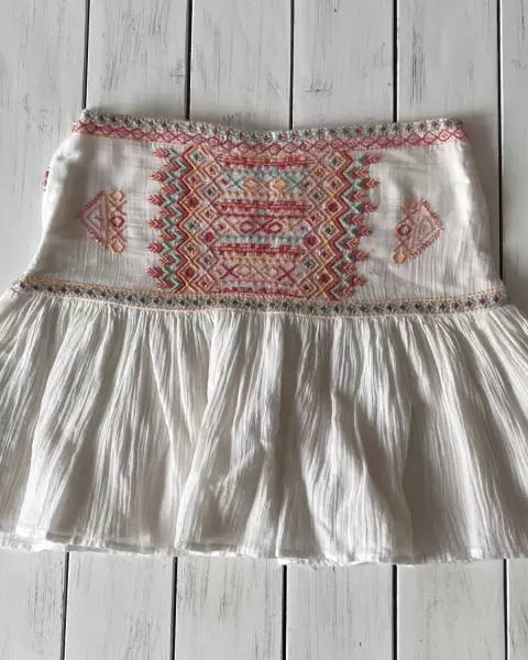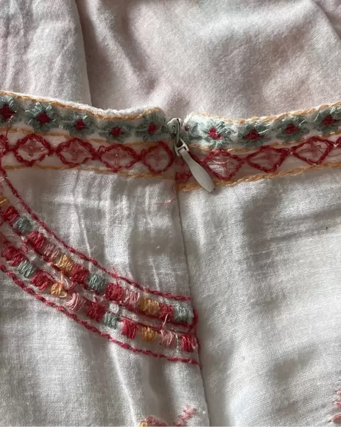 Falda con forro beige y bordado en parte superior, tipo manta, suave, cierre lateral. NO ESTIRA VER MEDIDAS. No tiene bolsillos. Algunos hilos pueden estar salidos y se remendó un poco de la bastilla.Talla: S Medidas: 36 cm cintura, 41 cm cadera y 39 cm de largo. NO ESTIRA.