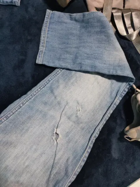 Jeans slim rectos T-5 / 7. •Te interesa? Escucho ofertas•Deseas varias prendas? armo tu paquete✨Jean's azul con deslavado (wax) y pequeñas roturas. Tiro medio/alto (llega al ombligo), tela rígida (estira poco). Bolsillos al frente y atrás. Corte recto. Talla 5 (posible 7)