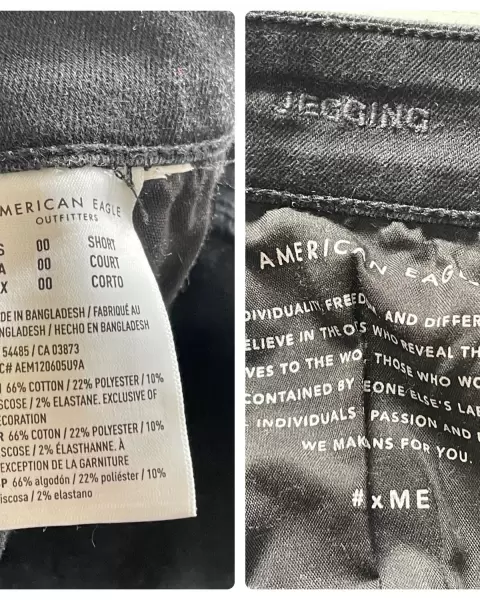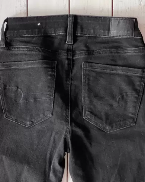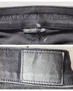 Jeans tipo jeggin negro deslavado American Eagle. Jeans tipo jeggingColor negro deslavadoTalla: 00 shortMedidas: 30 cm de cintura, 21.5 cm de tiro, 32 cm decadera (medido de costura a costura) y 68 cm deentrepierna.Ajuste medio (ni a la cadera ni a la cintura)Stretch